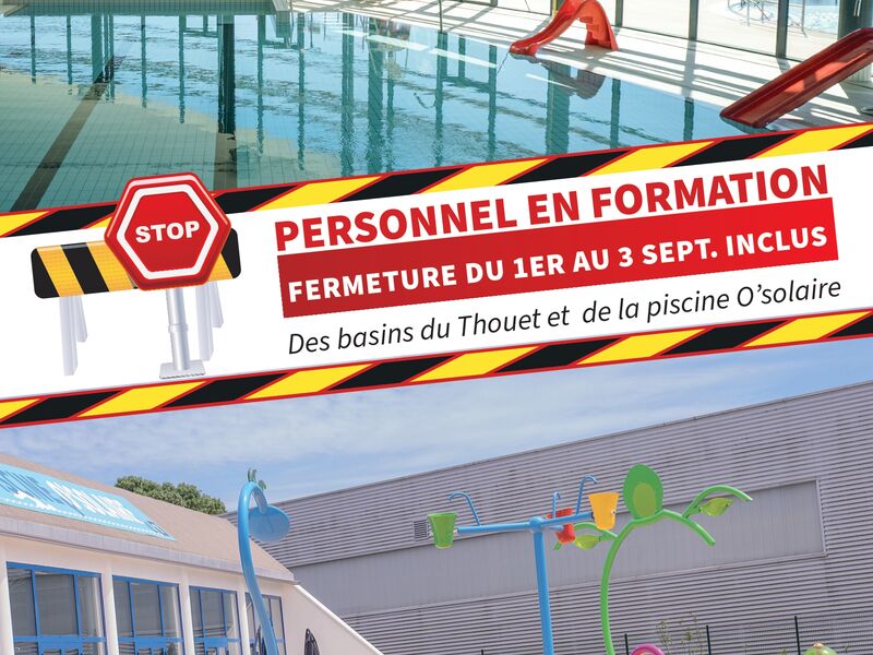 Le personnel des Bassins du Thouet et de la Piscine O’solaire sera en formation. Fermeture du 1er au 3 septembre inclus. Toute l’équipe des Piscines du Thouarsais vous remercie de votre...