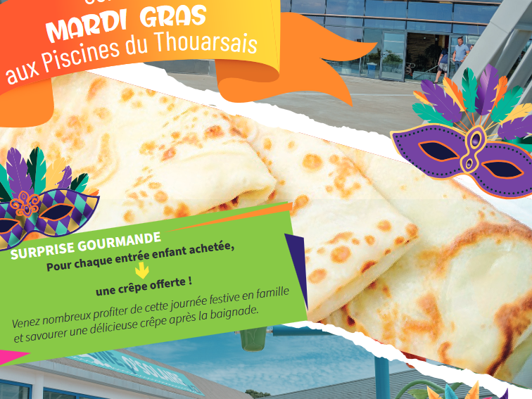 📅 Mardi 4 mars🕒 De 15h à 18h Cette année, Mardi Gras se fête dans toutes les Piscines du Thouarsais : Bassins du Thouet & Piscine O’Solaire ! Venez profiter d’une après-midi festive...