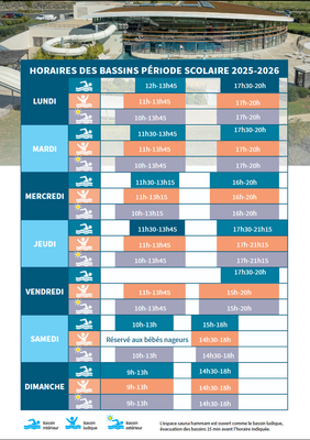👉 Consultez le planning complet des bassins (intérieur, ludique et extérieur) ci-dessous pour organiser vos séances de natation, de détente ou vos moments en famille.