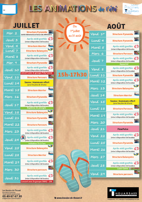 Du 1er juillet au 31 août 2025, les Bassins du Thouet vous proposent un programme riche et varié pour animer vos après-midis d’été. Petits et grands y trouveront leur bonheur grâce à des activités sportives, ludiques et festives, organisées entre 15h et 17h30.